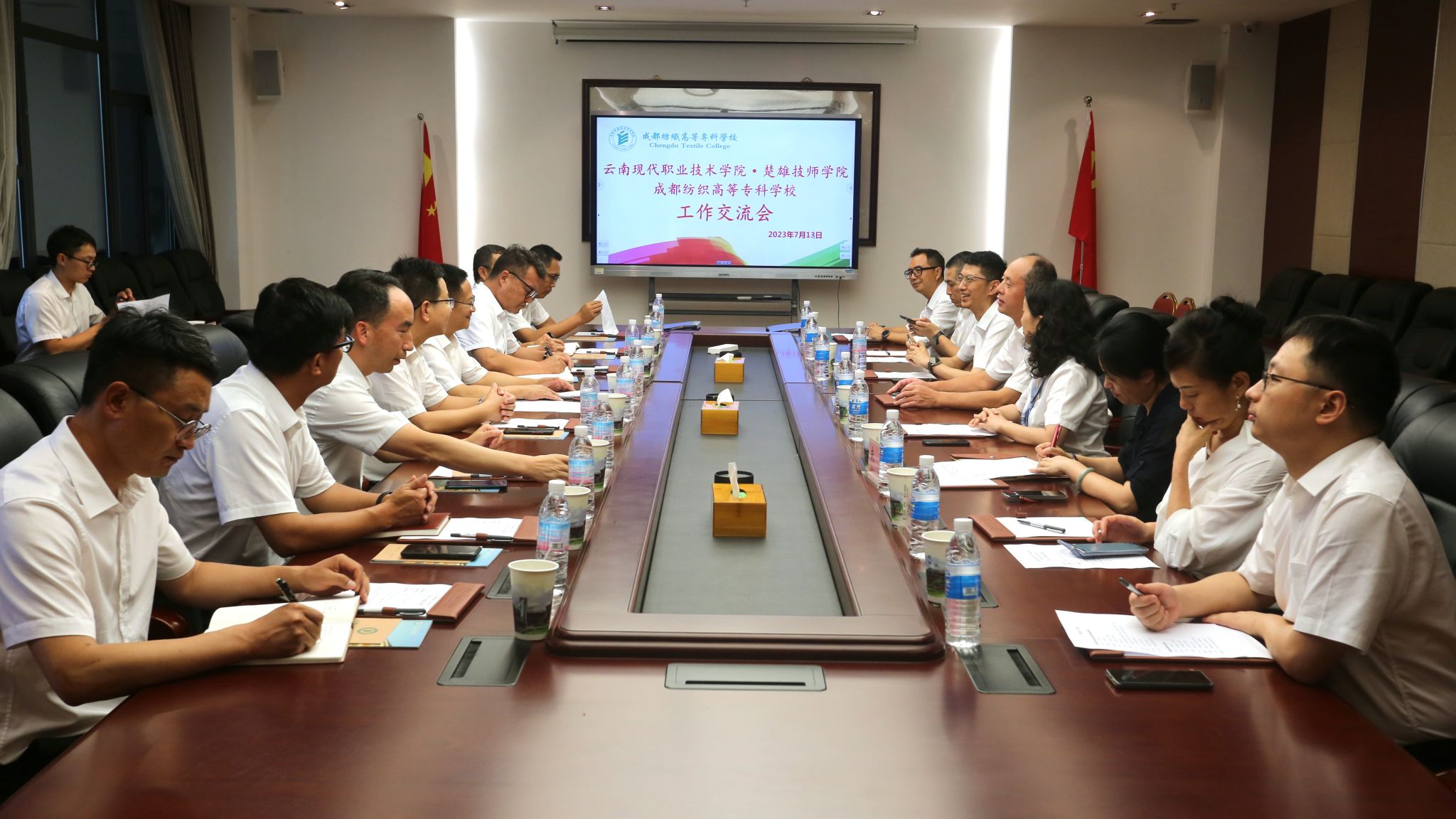 座谈会上,蔡玉波、王若舟分别介绍两校的历史与现状、办学定位和特色、发展目标和举措,交流了办学思想、治学理念和机构设置调整思路等。我校副校长宋超、云南现代职院副院长紫文才代表两校签订了《成都纺织高等专科学校云南现代职业技术学院·楚雄技师学院合作协议》。