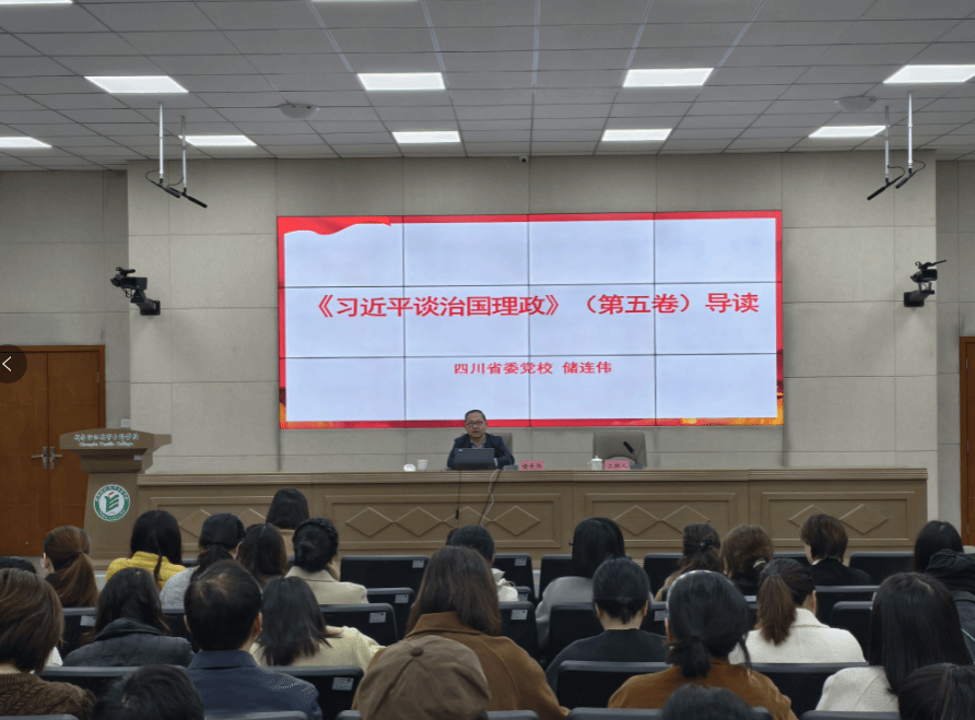 培训特邀四川省委党校党史教研部副主任、教授储连伟授课。他以《习近平谈治国理政》第五卷为核心,指出该书集中展现了党的新理论、新思想、新战略,是对改革发展稳定、内政外交国防、治党治国治军等重大课题的全新回应,具有重要指导意义。